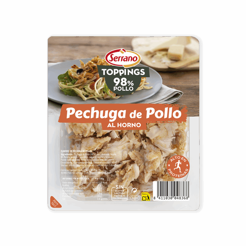 Utiliza como un topping esta Pechuga de Pollo al horno para platos como arroces, ensaladas, pastas o fajitas… Su sabor horneado te sorprenderá y su comodidad te conquistará. Se puede consumir en frío o en caliente y es alto en proteínas y bajo en grasas.