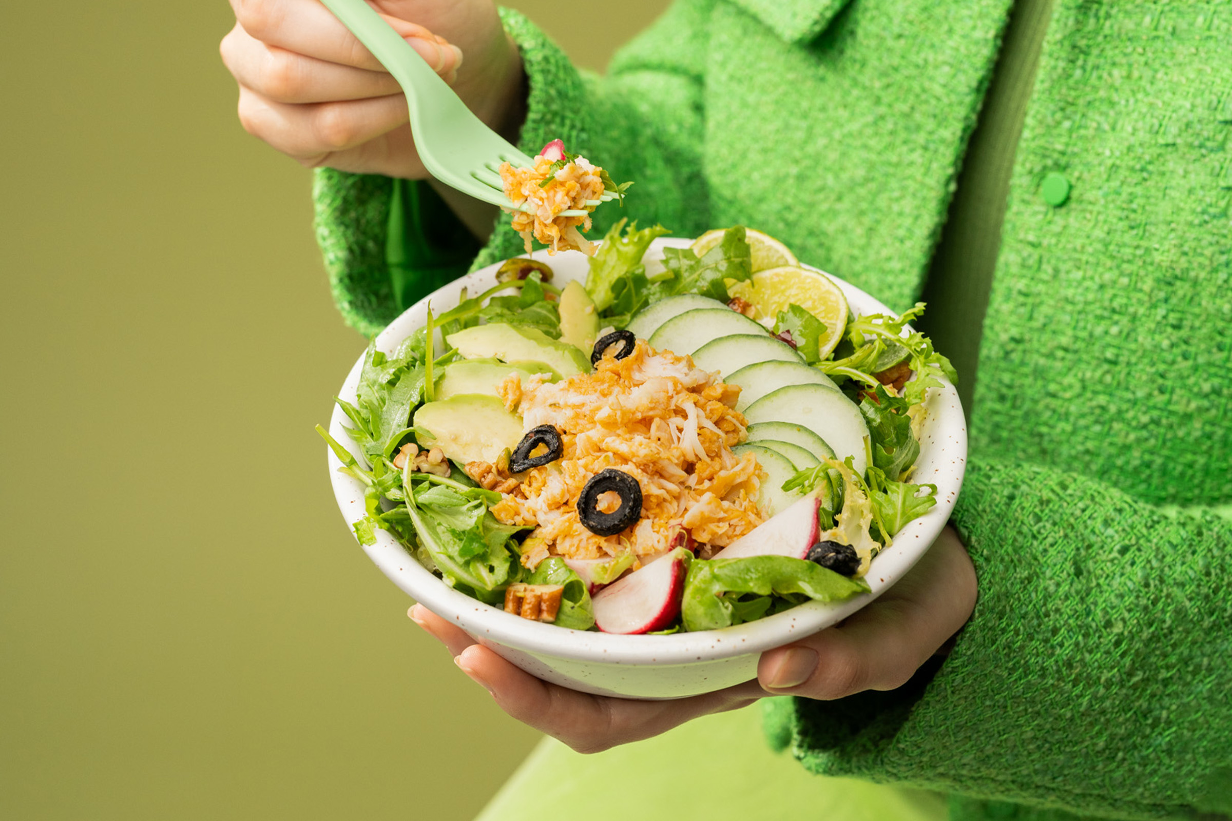 Monta la ensalada con los brotes verdes, el aguacate, el pepino y los rabanitos. Corónala con los toppings de pollo y las olivas deshidratadas. PASO 6