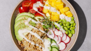 Para la preparación del Arroz: 200 g de Arroz salvaje, 3 semillas de cardamomo, 20 g de pipas de girasol, 60 g de coco rallado, semillas de cilantro, chutney de mango y platano macho.